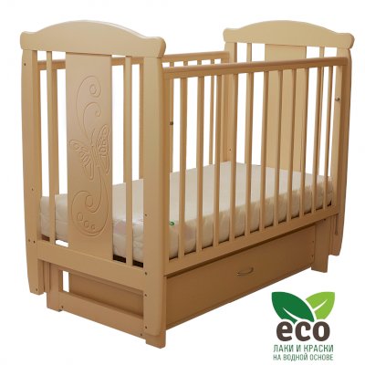 Кроватка декорирована фрезерным рисунком "Бабочка". Уникальные фрезерные рисунки размером от 50 см на обеих спинках.