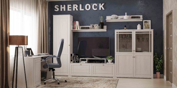 Неглубокий шкаф-сервант отлично вписывается в классическую гостиную SHERLOCK, дополняя ее. Его верхняя часть со стеклянной полочкой за тонированным стеклом. Эта часть - лицо серванта, на неё все обращают внимание и предназначена она для сервизов и дорогой посуды. Нижняя часть - вместительная тумба для повседневных вещей. Раскладка из профиля МДФ и массивные опоры этого модуля - отличительные черты коллекции SHERLOCK.