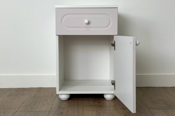 Модель оснащена выкатным ящиком на шариковых направляющих, обеспечивающих плавный и надёжный ход. В нижней части расположено отделение с распашной дверцей, которое подойдёт для хранения книг, игрушек, аксессуаров или текстиля.