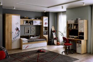 В закрытые шкафы и открытые ниши поместятся все учебники книги и сувениры. Эффектный принтерный рисунок на фасадах выдержан в общем стилистическом решении. Рисунок устойчив к истиранию и ультрафиолету. Можно повесить между шкафов над софой или использовать как самостоятельное изделие.